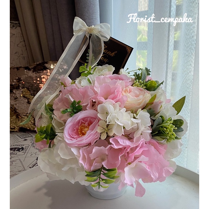 Ready stock gubahan bunga meja bulat siap hias dengan pasu hanya ~rm18 color pink,beige,purple,kuning,tiffany blue size~36cm tinggi termasuk pasu kalau nk .